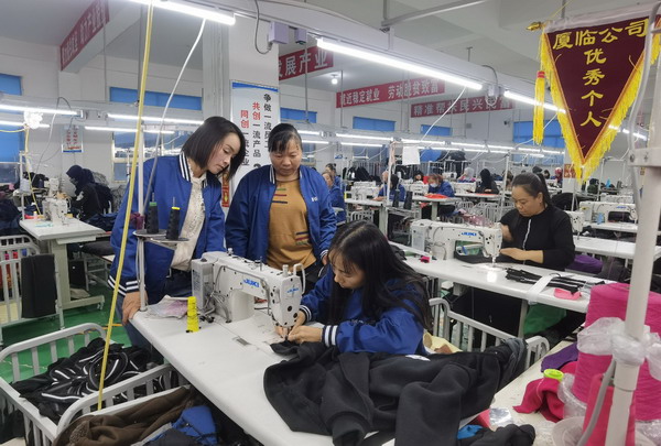 (新老結對(duì)實現了技能(néng)“傳幫帶”。圖為廈臨公司遠達服飾扶貧車間内,小組長(cháng)孟勝芳和駐廠師傅在對(duì)組員王德英進(jìn)行指導)