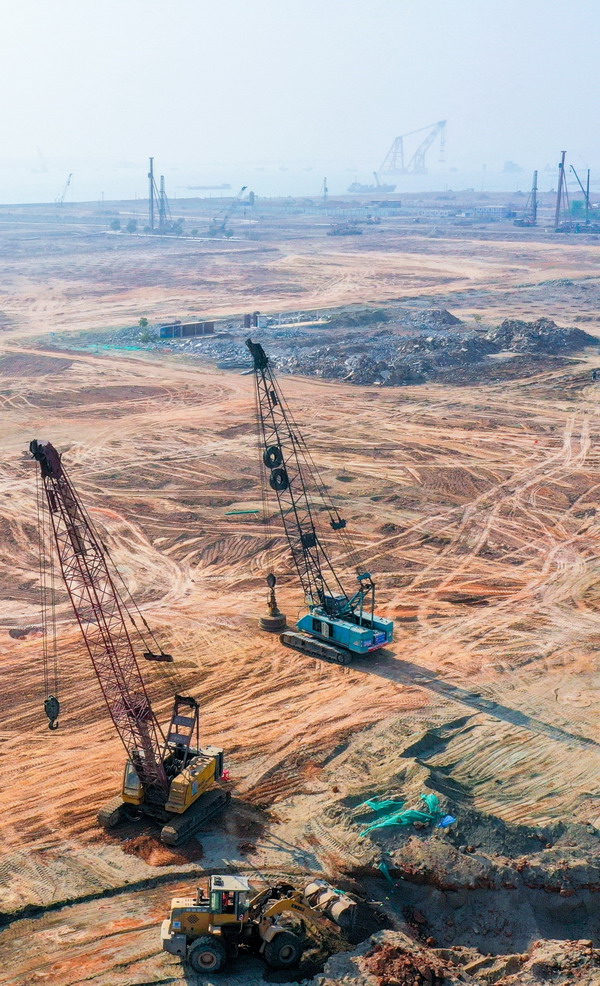 ▲新會(huì)展中心項目由國(guó)貿控股集團旗下國(guó)貿會(huì)展、國(guó)貿開(kāi)發(fā)負責投資、建設、運營。圖為項目的展覽中心正進(jìn)行強夯、試樁。