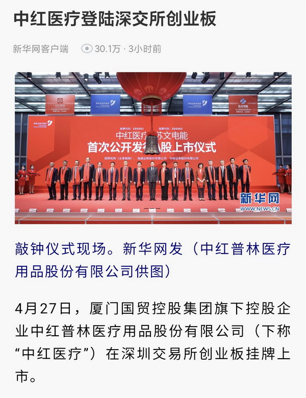 4月27日,廈門國(guó)貿控股集團旗下控股企業中紅普林醫療用品股份有限公司(下稱“中紅醫療”)在深圳交易所創業闆挂牌上市。
