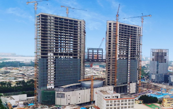 當然,使“門”字建築成(chéng)型,難度不小。國(guó)貿中心由兩(liǎng)棟超高層塔樓及頂部的連接體組成(chéng),塔樓間的跨度達40.2米,空中剛結構連廊的重量達1000噸以上。這(zhè)意味著(zhe),施工方需要把上千噸的連廊“爬”至百米高空。