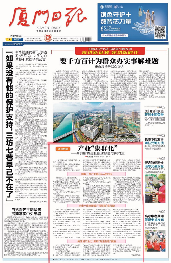 産業集群,是“中國(guó)制造”維持國(guó)際競争力的重要支點。而一個個特色産業集群,無不以激發(fā)“鍊式效應”為肇始。從這(zhè)個意義上來說(shuō),找準拓展産業鍊條、做強産業集群的發(fā)展路徑,或許就(jiù)找到(dào)了廈門發(fā)展先進(jìn)制造業的“鑰匙”。