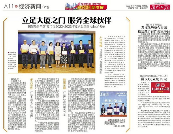11月15日,廈門市商務局召開(kāi)“廈門市商務局推進(jìn)對(duì)外開(kāi)放系列措施”新聞發(fā)布會(huì),現場發(fā)布了“2022年度A類國(guó)際化企業名單”,國(guó)貿控股集團旗下國(guó)貿股份、信達股份榮獲“廈門市2022年度A類國(guó)際化企業”。