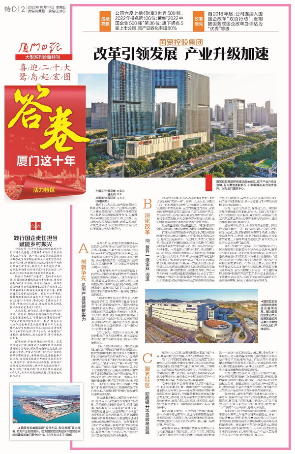 10月14日,《廈門日報》“喜迎二十大 鹭島起(qǐ)宏圖”專欄,以《改革引領發(fā)展 産業升級加速》對(duì)國(guó)貿控股集團引領産業高質量發(fā)展推進(jìn)工作,推出特别報道(dào),以下為報道(dào)全文。
